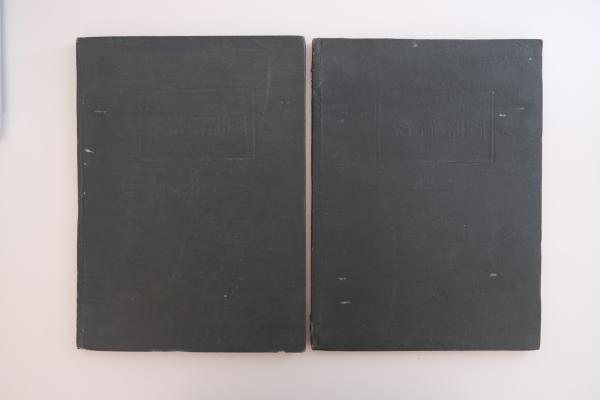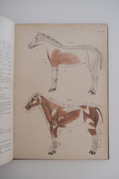 本品は「馬之部」第一輯(骨及靭帯)・第二輯(筋)の二冊揃。筋肉・骨格・靭帯などを精密な線画と彩色図で解説し、和文・ラテン語併記の部位表記を備える。