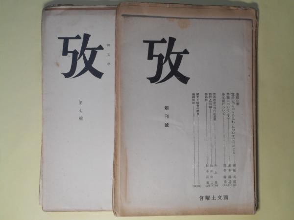 攷 創刊号~12号(昭和8年12月12日~10年3月23日)(うち第3号欠) 計11冊―宣長の「ものゝあはれ」について二三のこと(西尾光雄)、踏歌について(1)(木本通房)、仲文甫(喜多義勇)、枕草子を「読む」こと(喜多義勇)、木下長嘯子の俳諧(鳥山榛名)、森鴎外の小説(2)(坂本浩)、石川啄木の書簡(永積安明)、『幻』の巻に関連して(鈴木脩一)、師宣の版画(喜多義勇)、国木田独歩論(1)(坂本浩)、書記の一書「国稚地稚之時」の訓法(鈴木棠三)ほか