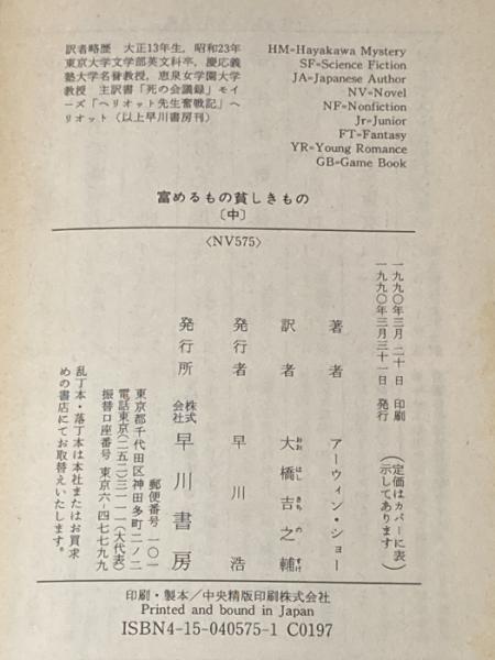 ※イタミ有 富めるもの貪しきもの 中 (ハヤカワ文庫 NV シ 1-5) 早川書房 アーウィン・ショー