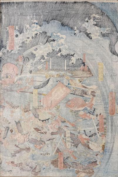 この浮世絵刊行の前年はコレラが大流行し、疫病の原因は魚であると考えられ野菜が高騰した。その争いに仮託して、一橋派と南紀派の抗争を当時劣勢の一橋派を魚で描いている。「蜜柑太夫」は紀州侯(14代将軍徳川家茂)、「大蛸」は徳川斉昭、「しゃち太子」は一橋慶喜とされる。