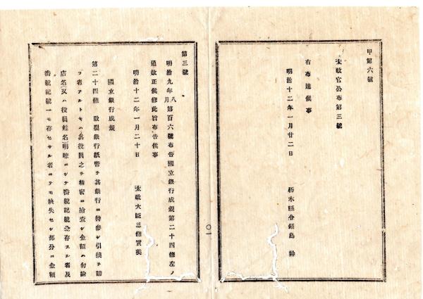 • 解説 N26012146○明治布告布達 明治12年○国立銀行成規 第24条改正 敗裂銀行紙幣(損傷紙幣)引替取扱方○太政官布告 栃木県○和本古書古文書