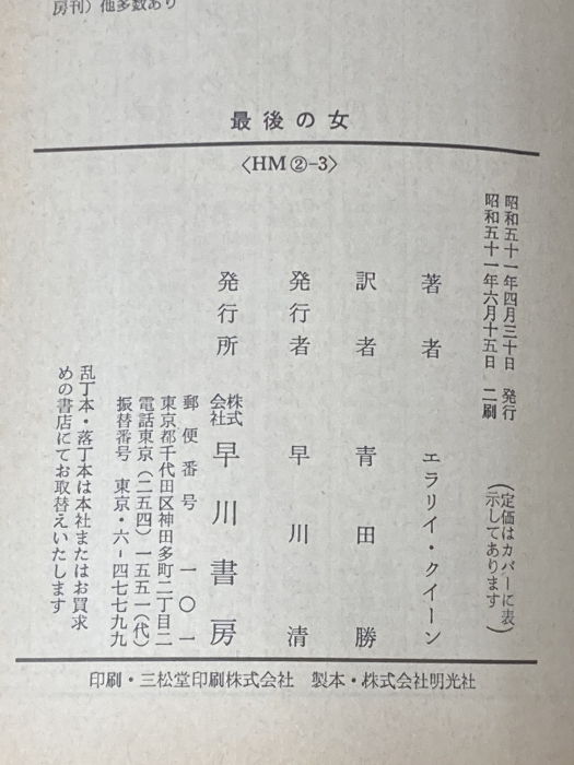※イタミ有 最後の女 (ハヤカワ・ミステリ文庫 2-3) 早川書房 エラリイ クイーン