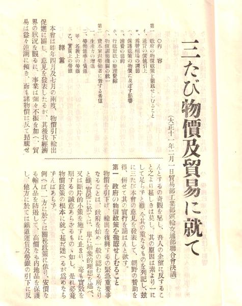 ※大正11年2月 三たび物価及貿易に就て(貿易部工業部運輸交通部聯合會決議)
