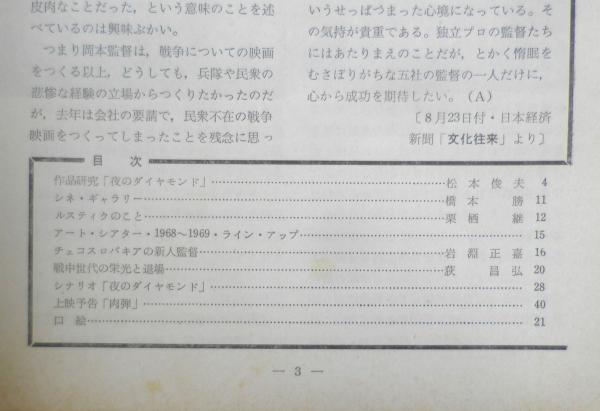 日本アート・シアター・ギルド 作品研究「夜のダイヤモンド」/松本俊夫 シネ・ギャラリー/橋本勝 ルスティクのこと/栗栖継 アート・シアター・1968~1969・ライン・アップ チェコスロバキアの新人監督/岩淵正嘉 戦中世代の栄光と退場/荻昌弘 シナリオ「夜のダイヤモンド」 上映予告「肉弾」 口絵