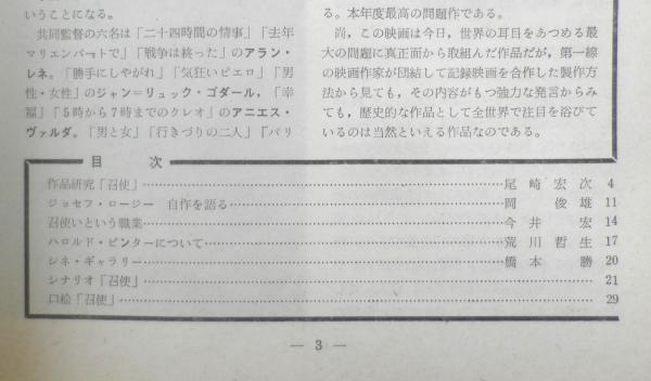 日本アート・シアター・ギルド 作品研究「召使」/尾崎宏次 ジョセフ・ロージー自作を語る/岡俊雄 召使いという職業/今井宏 ハロルド・ピンターについて/荒川哲生 シネ・ギャラリー/橋本勝 シナリオ「召使」 口絵「召使」