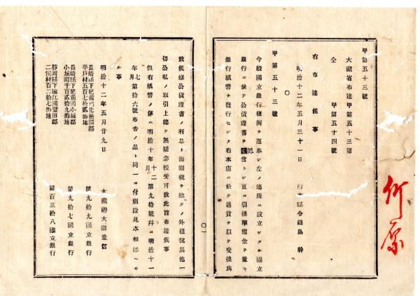 • 解説 N26012160○明治布告布達○国立銀行5行設立 第九十九,第九十七,第百三十八,第四十六,第百三十六国立銀行 大蔵卿大隈重信○明治12年大蔵省布達 栃木県○和本古書古文書