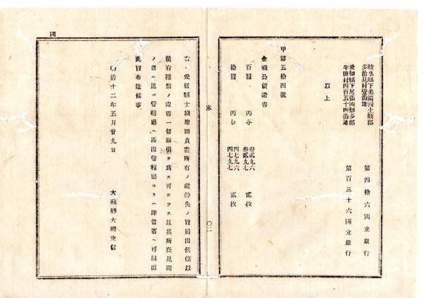 明治布告布達○国立銀行5行設立 第九十九,第九十七,第百三十八,第四十六,第百三十六国立銀行 大蔵卿大隈重信○明治12年大蔵省布達 栃木県○和本古書古文書