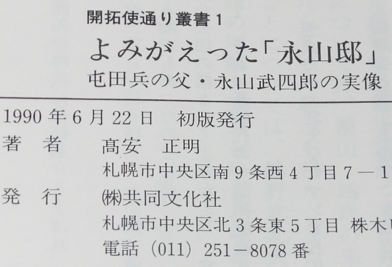 • 解説 開拓使通り叢書1 よみがえった「永山邸」 高安正明 共同文化社 1990年6月初版 B6判帯付