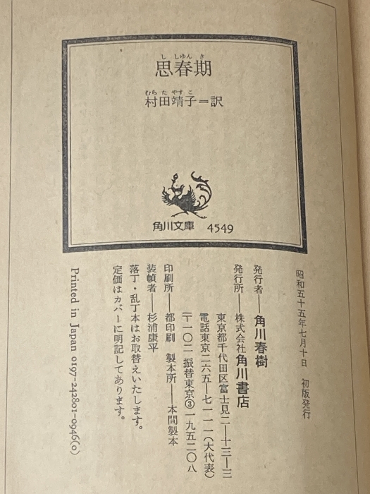 ※イタミ有 思春期 (1980年) (角川文庫) 角川書店 パトリシア・ディゼンゾ