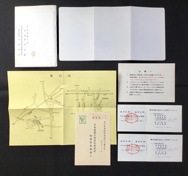 • 解説 優待通行証2点・ステッカー・案内地図・挨拶状 外袋付 大蔵大臣・愛知揆一(吉田茂の側近で田中内閣時大蔵大臣)宛 通番1番 開通祝賀式~昭和48年10月16日