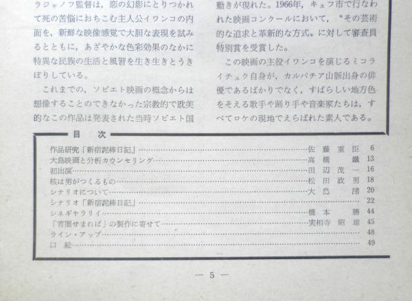 日本アート・シアター・ギルド 作品研究「新宿泥棒日記」/佐藤重臣 大島映画と分析カウンセリング/高橋鉄 初出演/田辺茂一 核は男がつくるもの/松田政男 シナリオについて/大島渚 シナリオ「新宿泥棒日記」 シネギャラリイ/橋本勝 「宵闇せまれば」の製作に寄せて/実相寺昭雄 ライン・アップ 口絵