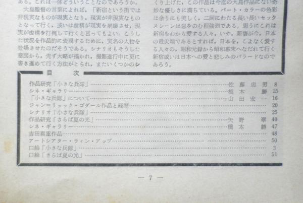 日本アート・シアター・ギルド 作品研究「小さな兵隊」/佐藤忠男 シネ・ギャラリー/橋本勝 「小さな兵隊」について/山田宏一 ジャン・リュック・ゴダール作品と経歴 シナリオ「小さな兵隊」 作品研究「さらば夏の光」/矢野翠 シネ・ギャラリー/橋本勝 吉田喜重作品 アートシアター・ライン・アップ 口絵「小さな兵隊」「さらば夏の光」