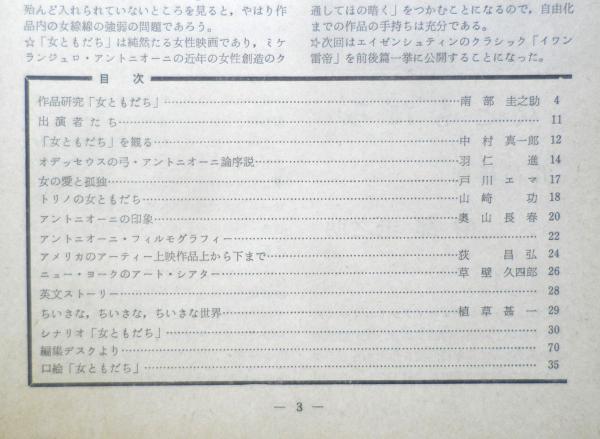 日本アート・シアター・ギルド 作品研究「女ともだち」/南部圭之助 出演者たち 「女ともだち」を観る/中村真一郎 オデッセウスの弓・アントニオーニ論序説/羽仁進 女の愛と孤独/戸川エマ トリノの女ともだち/山崎功 アントニオーニの印象/奥山長春 アメリカのアーティー上映作品上から下まで/荻昌弘 ニュー・ヨークのアート・シアター/草壁久四郎 ちいさな、ちいさな、ちいさな世界/植草甚一