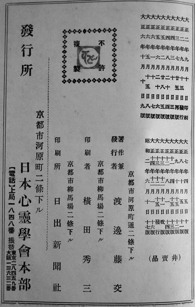 心霊治療秘書 渡邊藤交著 A5判三方金336p 第17版 非売 日本心霊学会本部 昭和2年