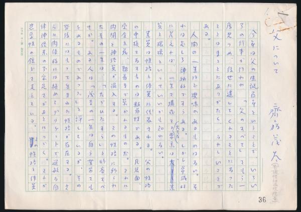 • 解説 ペン書き、400字詰原稿用紙3枚完、内容は父・斎藤茂吉についての随筆です。