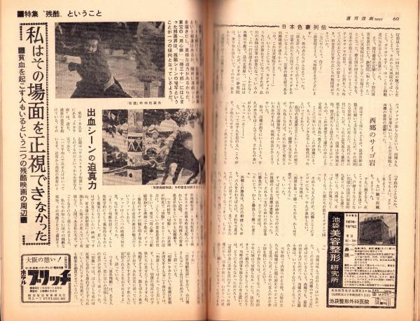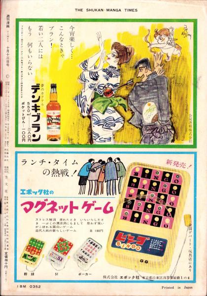 • 著者 〈茶の間に進出した「人間の条件」(藤由起子と加藤剛)モノクロ3頁〉〈三井美奈 モノクロ1頁〉〈貧血を起こす人もいるという2つの残酷映画の周辺 3頁〉、中村武志、南条範夫、村松駿吉、笹沢左保、馬場のぼる、野一色幹夫