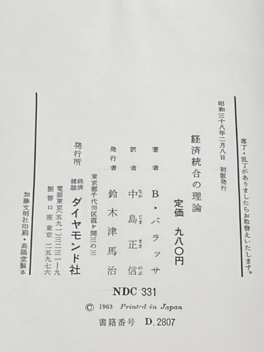 ※カバー無し 経済統合の理論 (1963年) B.バラッサ