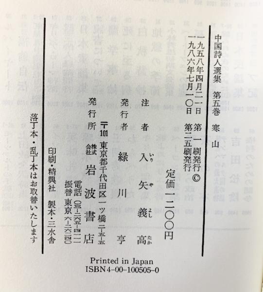 『寒山』中国詩人選集(5)入矢義高:注 岩波書店 編:吉川幸次郎 小川環樹 1986年