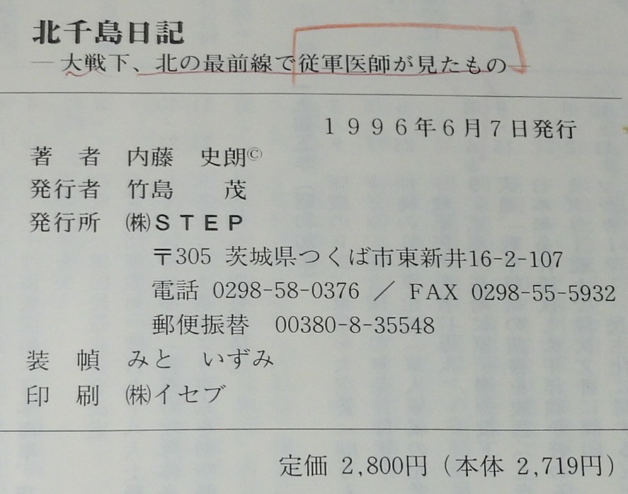 • 解説 北千島日記 大戦下、北の最前線で従軍医師が見たもの 内藤史朗 STEP 1996年6月発行 A5判ハードカバー、ビニカバ付.