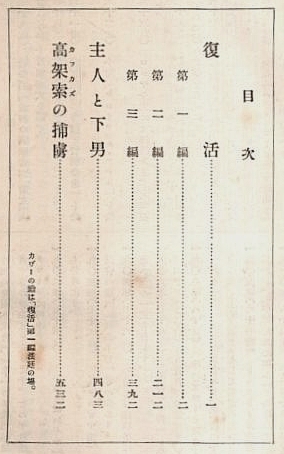 • 解説 初版 B六 函・カバー・登場人物栞付 559頁 函若干焼 カバー縁少傷み 若干焼シミ 扉頁蔵書印有 本文問題なし 程度並 700g外 「主人と下男」「高架索の捕虜」併録 ※目次画像有