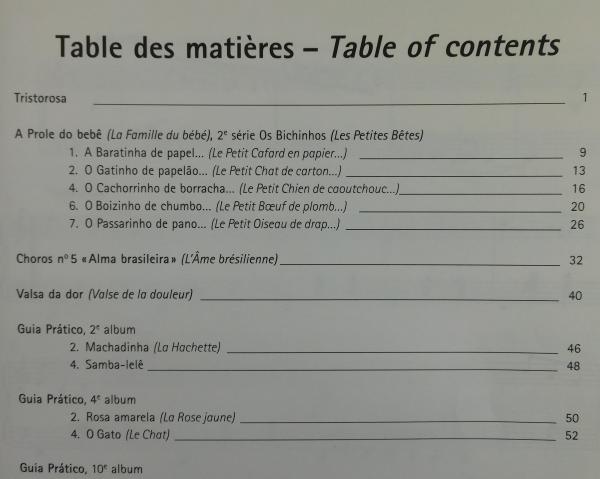 Contiene: Tristorosa A Baratinha de papel (Le Petit Cafard en papier) O Gatinho de papeleo... (LePetit Chat de carton) O Cachorrinho de borracha... (Le Petit Chien en caoutchouc) O Boizinho de chumbo... (Le Petit Bouf de plomb) O Passarinho de pano... (Le Petit Oiseau de drap) Choros n 5 Alma brasileira (Lエme brTilienne) Valsa da dor (Valse de la douleur) Machadinha (La Hachette) Samba-lel Rosa amarela (La Rose jaune) O Gato (Le Chat) Nesta rua (Dans cette rue) Fui no ltoror「 [1a versao] (Je suis all ltoror [1er version] Prelude n 1 Prelude n 2 Prelude n 3 Prelude n 4