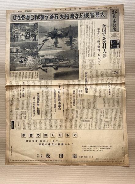 • 解説 岩手東海新聞 昭和35年5月24日夕刊2枚(関連記事2ページ)、産経新聞 昭和35年5月25日朝刊2枚(関連記事2ページ)、4枚とも切れ目・破れあります。