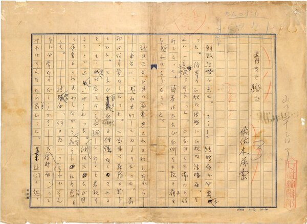 • 解説 『青きを踏む』 ペン書 400字詰原稿用紙35枚完 「女性編輯部」の印、雑誌のカット指定がある。(種別)小説 #八木書店近代自筆物/1.草稿類 #95号近代文学特輯 95109547 ※自筆物につきましては、毎月25日前後に新蒐品を追加しております。PDF形式で御覧になりたい方は https://company.books-yagi.co.jp/archives/news/10928 を参照ください。