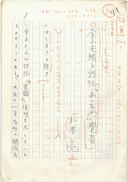 • 解説 『金子光晴と詩誌「あいなめ」覚書』 鉛筆書 200字詰原稿用紙26枚完 金子光晴への追悼文。詩誌「あいなめ」(金子光晴追悼号・昭和50年12月号)掲載。(種別)追悼文 #八木書店近代自筆物/1.草稿類 #95号近代文学特輯 95402639 ※自筆物につきましては、毎月25日前後に新蒐品を追加しております。PDF形式で御覧になりたい方は https://company.books-yagi.co.jp/archives/news/10928 を参照ください。