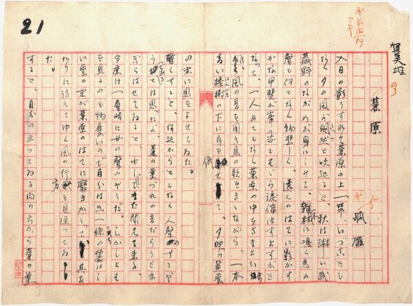• 解説 『蒹原』 ペン書 400字詰原稿用紙4枚完 帖仕立 少むれ 「孤雁」名義。武蔵野の風景を描写。写生文に近い。(種別)随筆 #八木書店近代自筆物/1.草稿類 #95号近代文学特輯 95803568 ※自筆物につきましては、毎月25日前後に新蒐品を追加しております。PDF形式で御覧になりたい方は https://company.books-yagi.co.jp/archives/news/10928 を参照ください。