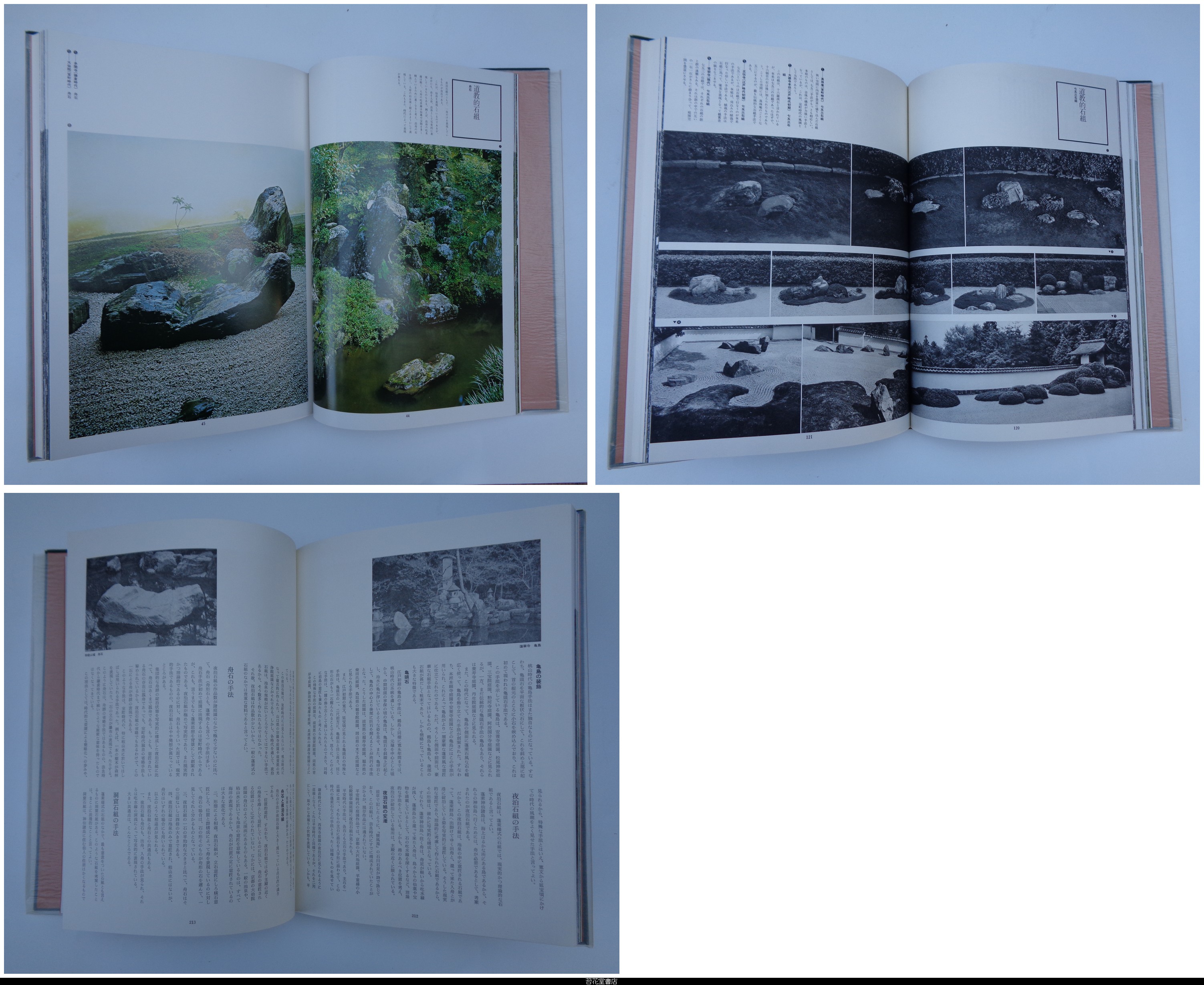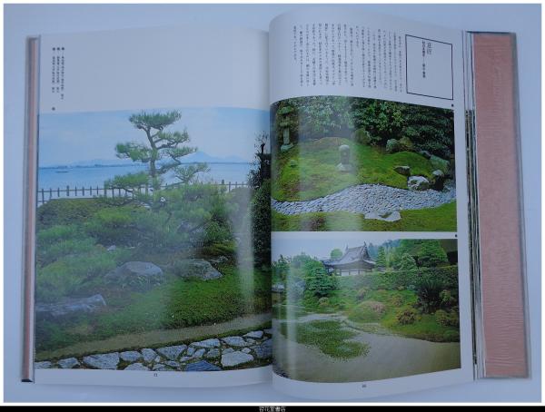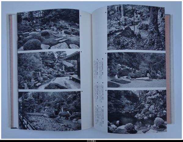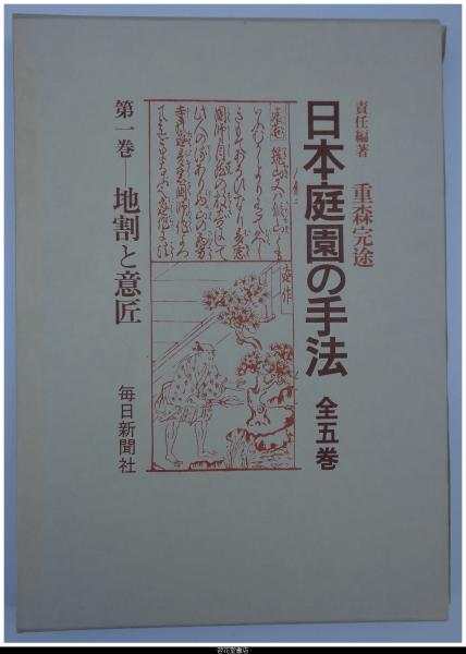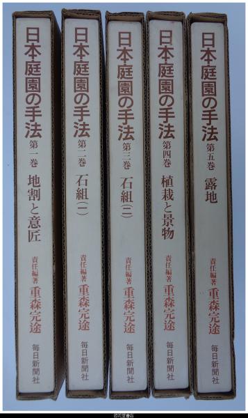 • 解説 初版 全5冊揃 二重箱 外箱スレ傷み有 内箱すれシミ有 -写真(カラー、モノクロ)、平面実測図、解説 1・地割と意匠(池泉様式、枯山水様式 27箇所)/2・石組1(道教的石組、仏教的石組、神道的石組 20箇所)/3・石組2(滝石組、流れの石組、築山石組・護岸石組、橋石組、飛石・敷石 20箇所以上)/4・植栽と景物(植栽(自然手法、超自然手法)、景物(垣根、土塀・石垣塀、燈籠、苔・芝、その他)、雑木の庭)/5・露地(16箇所)