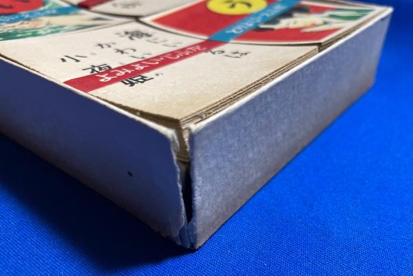 • 解説 かるた帯4点のうち1点が破れて外れています。かるた表裏面にヤケシミ、函縁角折れ山に擦れイタミ・表面に少剥げキズ・少ヤケシミ、函側面に退色、函身側の側面折れ山に数か所破れ 函底にヤケヨゴレがありますがそれ以外は概ね良好です。