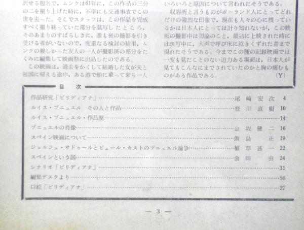 日本アート・シアター・ギルド 作品研究「ビリディアナ」/尾崎宏次 ルイス・ブニュエルその人と作品/登川直樹 ルイス・ブニュエル・作品歴 ブニュエルの肖像/金坂健二 スペイン映画について/飯島正 ジョルジュ・サドゥールとピェール・カストのブニュエル論争/植草甚一 スペインという国/会田由 シナリオ「ビリディアナ」 編集デスクより 口絵「ビリディアナ」
