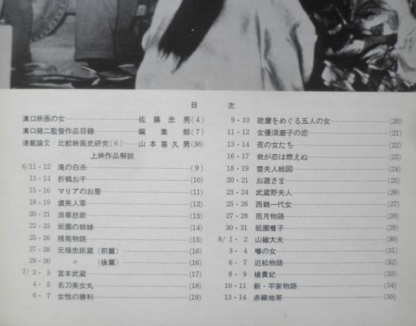 グラシン紙かけ 溝口映画の女/佐藤忠男 溝口健二監督作品目録 上映作品解説 滝の白糸 マリアのお雪 虞美人草 残菊物語 元禄忠臣蔵 名刀美女丸 女優須磨子の恋 我が恋は燃えぬ 雪夫人絵図 お遊さま 武蔵野夫人 西鶴一代女 雨月物語 山椒大夫 近松物語 新・平家物語 他