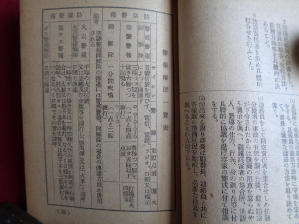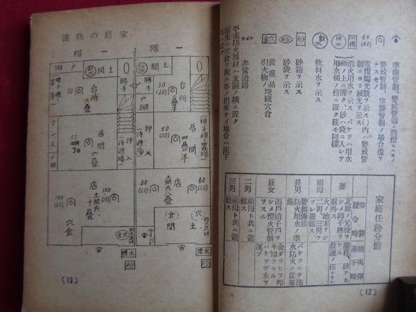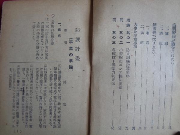 戦時下の家庭防空強化資料(昭和16年11月、東京市)防護計画、防空実施、警戒警報、空襲警報、焼夷弾投下、隣組・家庭、防火訓練指導順序、各種投下爆弾効力判定表、空襲災害時に於ける報告要領(系統図)、警報伝達一覧表ほか