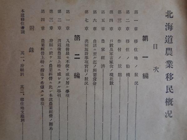 北海道農業移民概況 第一次(北海道庁、大正10年)五ヵ年以内の実況、道内移住地各支庁の状況、移住の動機、作付けの状況、共同施設ほか、◉別冊ガリ版印刷資料「移住減退の原因」(6頁)これは間に挟まっていたものです