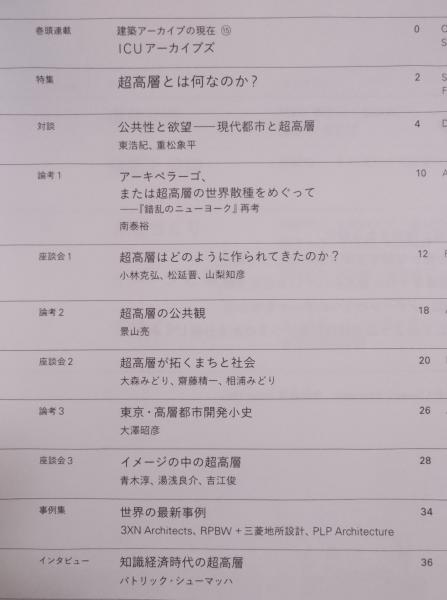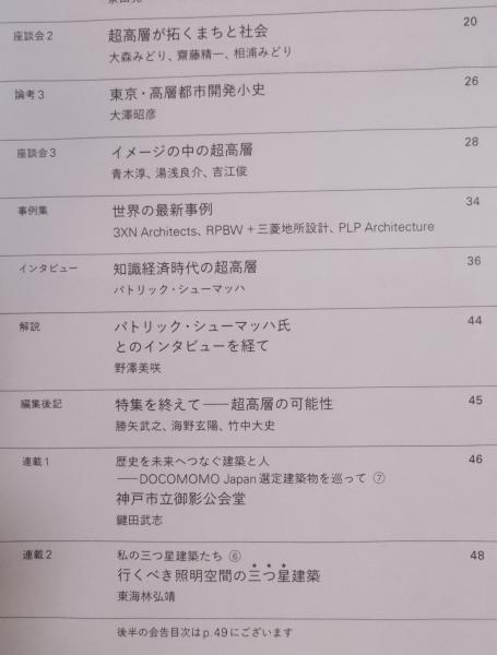 • 著者 特集執筆者 : (対談)東浩紀×重松象平/(座談会)青木淳×湯浅良介×吉江俊/パトリック・シューマッハ ほか
