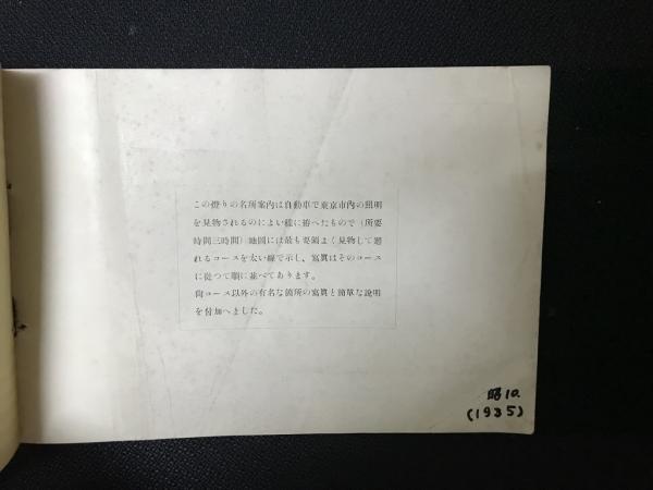 この燈りの名所案内は自動車で東京市内の照明を見物されるのによい様に拵へたもので(所要時間三時間)地国には最も要領よく見物して廻れるコースを太い線で示し、写真はそのコースに従つて順に並べてあります。