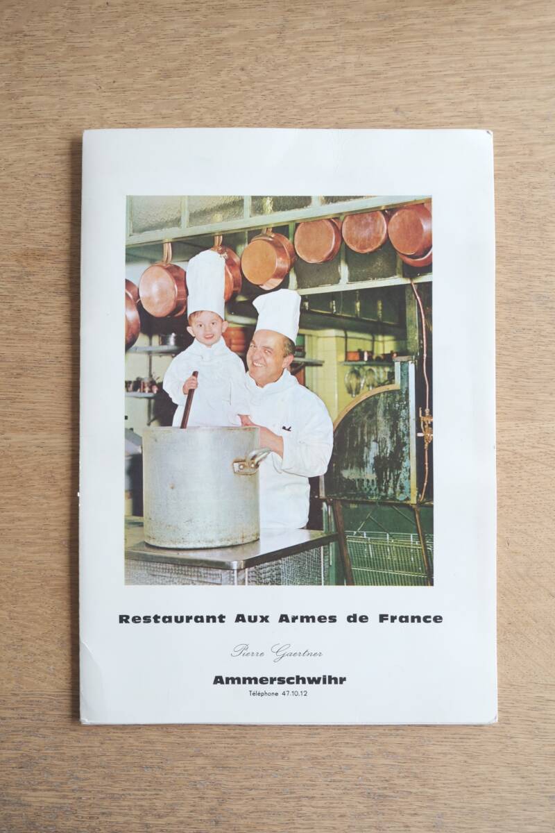 • 解説 フランス・アルザス地方アメルシュヴィール(Ammerschwihr)にある名店レストラン「Aux Armes de France」のヴィンテージ・メニュー表。シェフ、ピエール・ゲルトナー(Pierre Gaertner)の時代のものとされる。