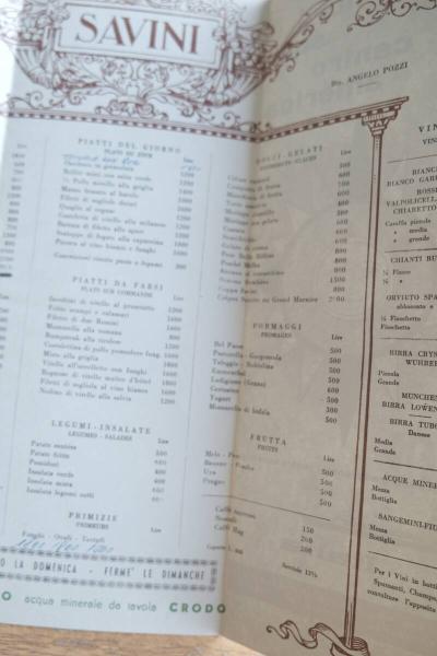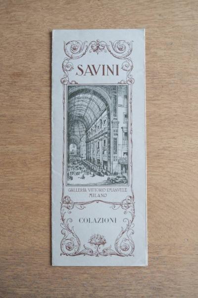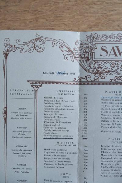 • 解説 ミラノのガレリア・ヴィットリオ・エマヌエーレに店舗を構える老舗レストラン「SAVINI(サヴィーニ)」による、1966年10月1日付の朝食メニュー。イタリア語・フランス語併記で構成され、当時の価格表記や装飾的な銅版画風デザインが残されている。