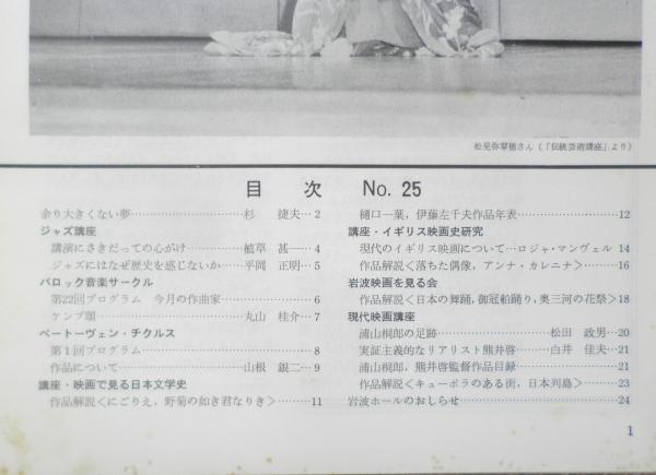 あまり大きくない夢/杉捷夫 ジャズ講座/植草甚一・平岡正明 バロック音楽サークル/丸山桂介 ベートーヴェン・チクルス/山根銀二 講座・イギリス映画史研究 作品解説/にごりえ、野菊の如き君なりき 樋口一葉、伊藤左千夫作品年表 岩波映画を見る会 現代映画講座/松田政男・白井佳夫 他