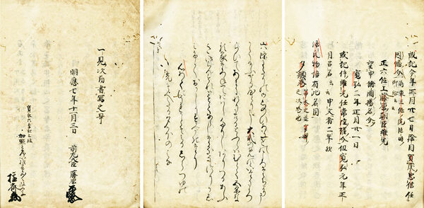 • 解説 本奥書・明応3年亜槐拾遺郎 高嶺文庫=八代国治旧蔵 名誉職とした山城・上総・上野・常陸・近江の介の部類記。壺井義知、鶴翁は江戸の考証学者。「高嶺文庫」の蔵印あり。