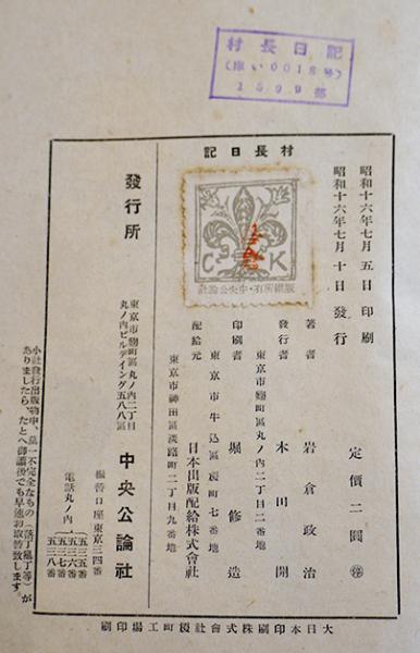 村長日記 岩倉政治著/武者小路実篤装幀 B6判初版(箱テープ補修)本体並上本 中央公論社 昭和16年