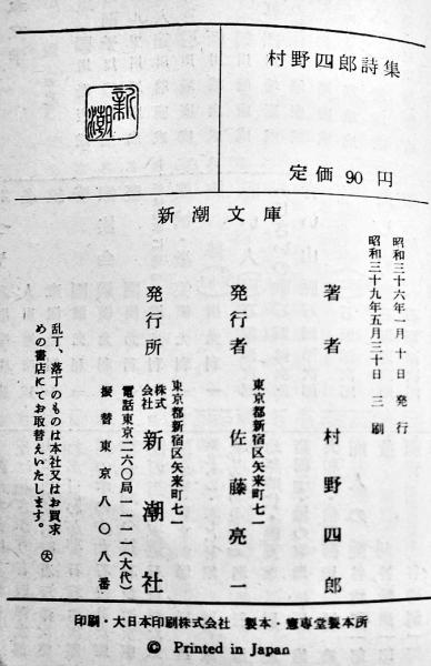 村野四郎詩集 伊藤信吉解説 3刷パラフィンカバ帯 新潮文庫 昭和39年