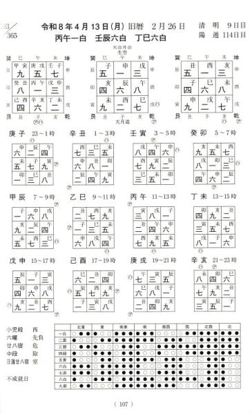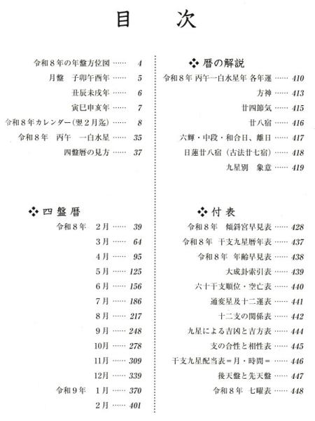 【目 次】●令和8年の年盤方位図 ●月盤 子卯午酉年 ・丑辰未戌年・寅巳申亥年 ●8年カレンダー(翌2月迄)●令和8年丙午 一白水星 ●四盤暦の見方●四盤暦 ★暦の解説 ●令和8年 丙午一白水星年各年運 ●方神 ●廿四節気 ●廿八宿 ●六輝・中段・和合日、離日● 日蓮廿八宿(古法廿七宿) ●九星別象意 ★令和8年 傾斜宮早見表 ●令和8年 干支九星曆年表 ●令和8年 年齢早見表 ●大成卦索引表 ●六十干支順位・空亡表 ●通変星及十二運表 ●十二支の関係表 ●九星による吉凶と吉方表 ●支の合性と相性表 ●干支九星配当表月・時間 446 ●後天盤と先天盤●令和8年七曜表