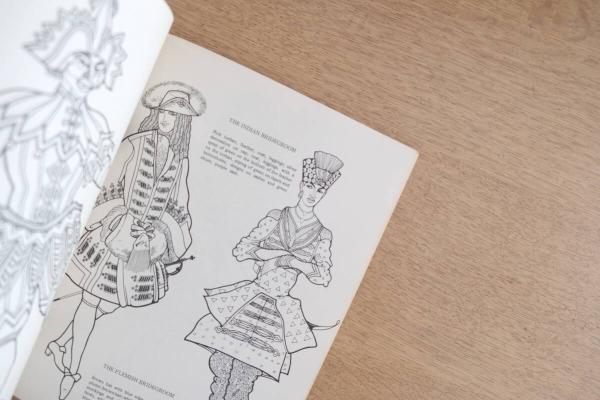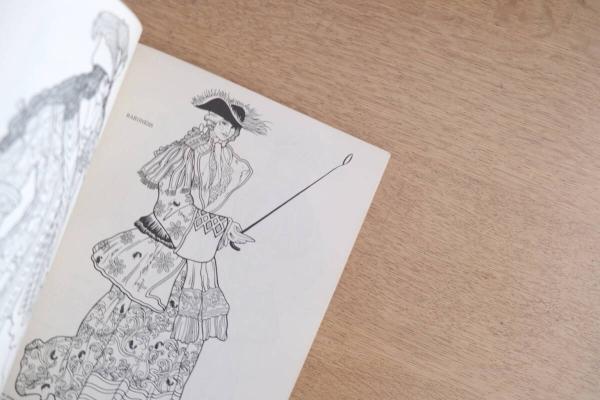 • 解説 チャイコフスキー作曲『眠れる森の美女』のためにレオン・バクストが手がけた舞台衣装デザインをもとに構成された、1977年刊行のヴィンテージぬり絵ブック。