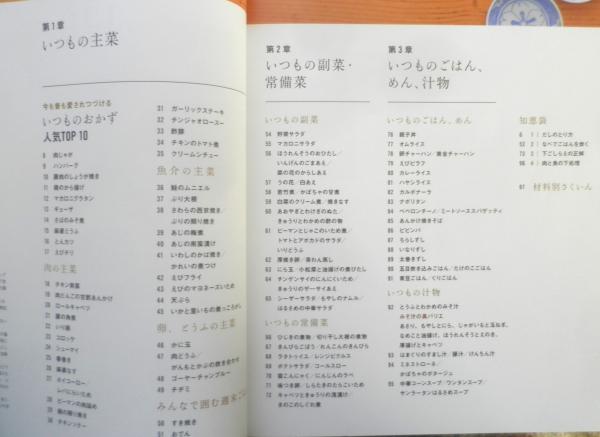 第1章/いつもの主菜 いつものおかず人気TOP10 肉の主菜 魚介の主菜 卵、とうふの主菜 みんなで囲む週末ごはん 第2章/いつもの副菜・常備菜/いつもの副菜 いつもの常備菜 第3章/いつものごはん、めん、汁物/いつものごはん、めん いつもの汁物 知恵袋 材料別さくいん 他