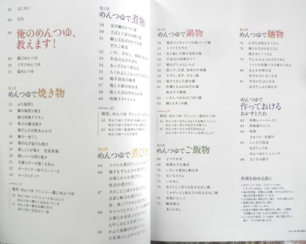 俺のめんつゆ、教えます!/濃口めんつゆ・うす口めんつゆ・塩めんつゆ 第1章/めんつゆで焼き物 第2章/めんつゆで煮物 第3章/めんつゆで煮びたし 第4章/めんつゆで鍋物 第5章/めんつゆでご飯物 第6章/めんつゆで鍋物 めんつゆで作っておけるおかずとたれ 他