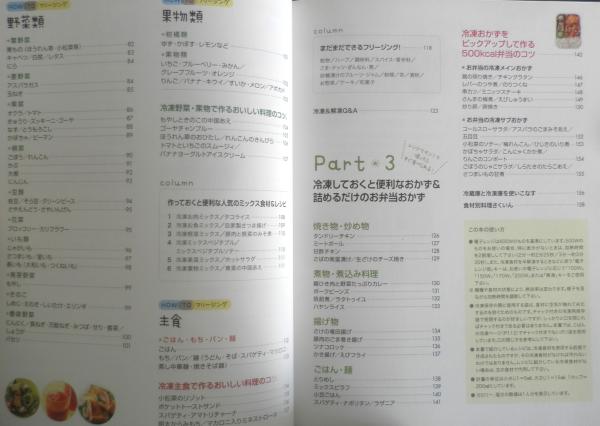 Part1/家に帰ってスピードごはん Part2/冷凍保存・解凍の基本テク&レシピ 肉類 魚介類 卵・牛乳・乳製品 豆・豆製品・こんにゃく 野菜類 果物類 主食 Part3/冷凍しておくと便利なおかず&詰めるだけのお弁当おかず 焼き物・炒め物 煮物・煮込み料理 揚げ物 ごはん・麺 他