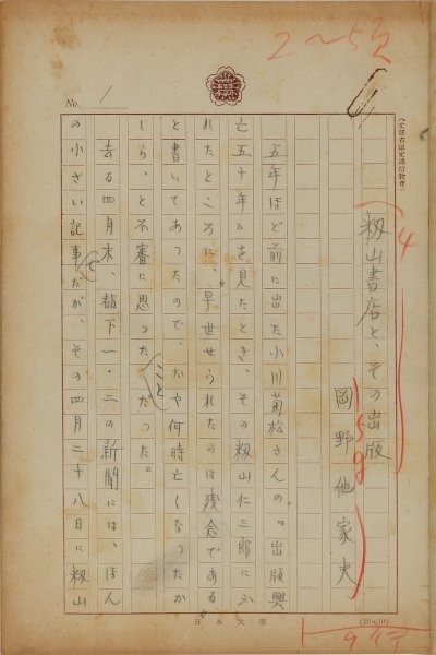 • 解説 『籾山書店と、その出版』 鉛筆書 200字詰原稿用紙24枚完 和装 籾山書店、籾山仁三郎の業績について。(種別)追悼文 #八木書店近代自筆物/1.草稿類 #95号近代文学特輯 95903589 ※自筆物につきましては、毎月25日前後に新蒐品を追加しております。PDF形式で御覧になりたい方は https://company.books-yagi.co.jp/archives/news/10928 を参照ください。