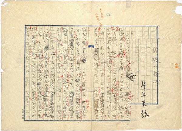 • 解説 『誇張の核心』冒頭 ペン書 400字詰原稿用紙6枚未完 「天弦」名義 切貼 傷み 文芸雑誌「趣味」掲載。(種別)資料 #八木書店近代自筆物/1.草稿類 #95号近代文学特輯 95210118 ※自筆物につきましては、毎月25日前後に新蒐品を追加しております。PDF形式で御覧になりたい方は https://company.books-yagi.co.jp/archives/news/10928 を参照ください。